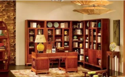 新中式書房是中式與現(xiàn)代元素的巧妙柔和。家具繼承了傳統(tǒng)明清家具,以實(shí)木為主,顏色多為紫檀或紫檀,顏色較深。