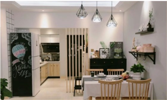 小型戶型的餐廳與廚房相連,可將餐廳和廚房合二為一,讓兩個空間的動線共享,實現(xiàn)“1+1>2”的空間利用,營造出一個獨立又舒適的用餐和烹飪空間。